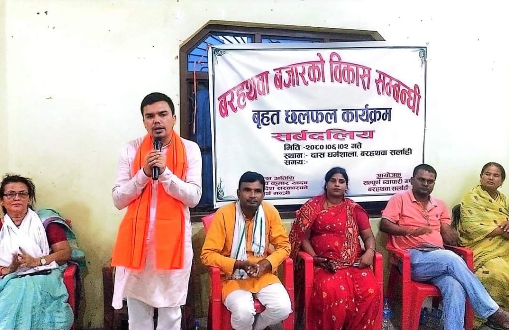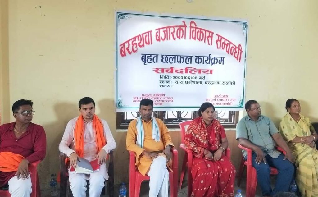 सर्लाहीको बरहथवा बजारको विकास सम्बन्धि सर्वदलीय छलफल गरिएको छ । बरहथवा बजारका ब्यापारीको आयोजनामा मंगलबार बरहथवा-७ स्थित दास धर्मशालामा कार्यक्रमको आयोजना गरिएको हो ।